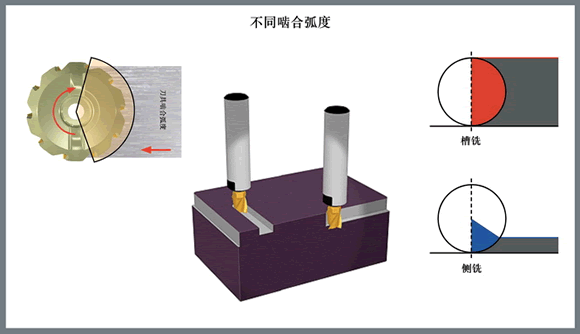 不同銑削工藝的嚙合弧也不同。例如在槽銑中,工件材料在加工過(guò)程中包圍一半的刀具;嚙合弧是刀具直徑的 100%。切削刃一半的加工時(shí)間都花在切削上,因此熱量迅速積聚。這種情況與側銑不同,在側銑中,任何時(shí)候都只有相對較小的刀具部分與工件嚙合,并且切削刃有更多的機會(huì )向空氣中散熱。