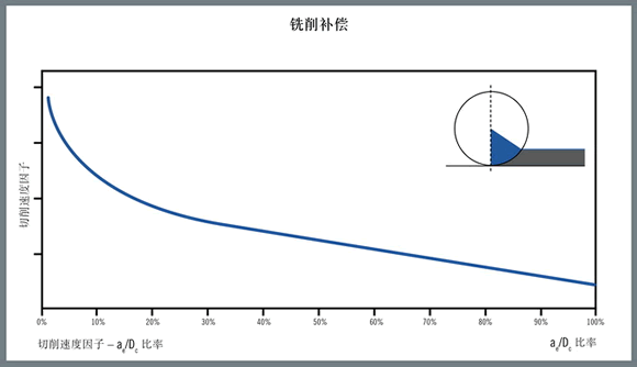 為了保持切削區內的切屑厚度和溫度與刀具在滿(mǎn)刀切削時(shí)的值相等,刀具供應商制定了補償系數,用于在刀具嚙合量百分比減小時(shí)增加切削速度。